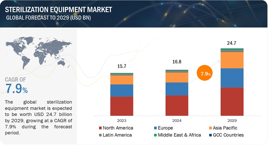 Sterilization Equipment Market trends forecast revenue growth from $16.8 billion in 2024 to $24.7 billion by 2029 at a CAGR of 7.9%. The comprehensive study includes industry trends, patent analysis, conference materials, and market buying behavior. Growth is fueled by the rise of HAIs, increasing surgical procedures, demand for food sterilization, and the outsourcing of sterilization services by the pharmaceutical and hospital sectors.