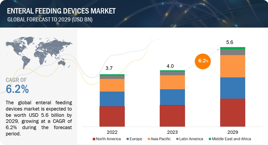Enteral Feeding Devices Market in terms of revenue was estimated to be worth $4.0 billion in 2024 and is poised to reach $5.6 billion by 2029, growing at a CAGR of 6.2% from 2024 to 2029 according to a latest report published by MarketsandMarkets™.