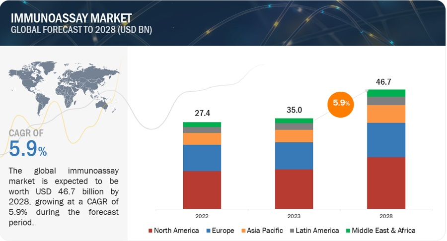 The report "Immunoassay Market by Product (Reagents & Kits, Analyzers), Technology (ELISA, CLIA, Rapid Tests), Specimen (Blood, Saliva, Urine), Application (Infectious Diseases, Endocrinology), End User (Hospitals & Clinics, Blood Banks) - Global Forecast to 2028", is projected to reach USD 46.7 billion by 2028 from USD 35.0 billion in 2023, at a CAGR of 5.9% during the forecast period. The immunoassay market is driven by the increasing incidence of infectious and chronic diseases, increasing adoption of immunoassay-based POC testing and rapid testing, and introduction of innovative products by leading players operating in the immunoassay market. Growth in emerging countries and development of condition specific biomarkers and tests are anticipated to offer lucrative growth opportunities for the immunoassay market.