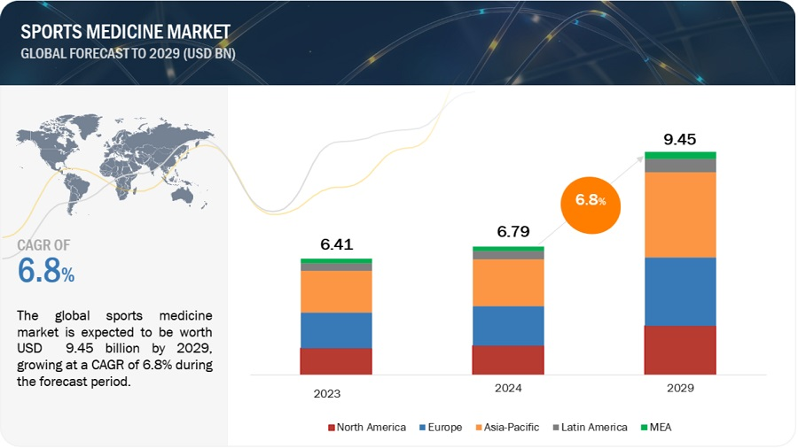 The Sports medicine market is expected to grow from $6.79 billion in 2024 to $9.45 billion by 2029, driven by a 6.8% CAGR. Factors such as the rise in sports injuries, more sports participation, and increased R&D expenditure are key drivers. Despite challenges like high product costs and stringent regulations, advancements in health technologies and improving healthcare infrastructure in developing countries present lucrative opportunities.