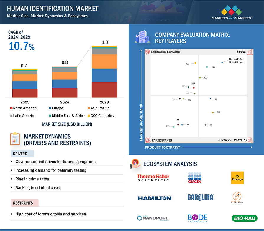 Human Identification Market in terms of revenue was estimated to be worth $0.8 billion in 2024 and is poised to reach $1.3 billion by 2029, growing at a CAGR of 10.7% from 2024 to 2029 according to a new report by MarketsandMarkets™.