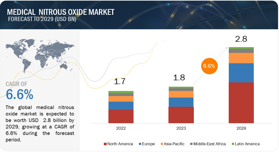 Medical Nitrous Oxide Market valued at US$1.7 billion in 2022, is forecasted to grow at a robust CAGR of 6.6%, reaching US$1.8 billion in 2023 and an impressive US$2.8 billion by 2029.The market is primarily driven by factors such as the growing aging population, advancements in healthcare infrastructure, demand for non-invasive pain relief methods, and supportive regulations regarding the use of medical gases. Additionally, the rising number of surgical procedures in both developed and developing countries presents opportunities for the increased use of medical nitrous oxide in anesthesia and analgesia, further driving industry expansion.