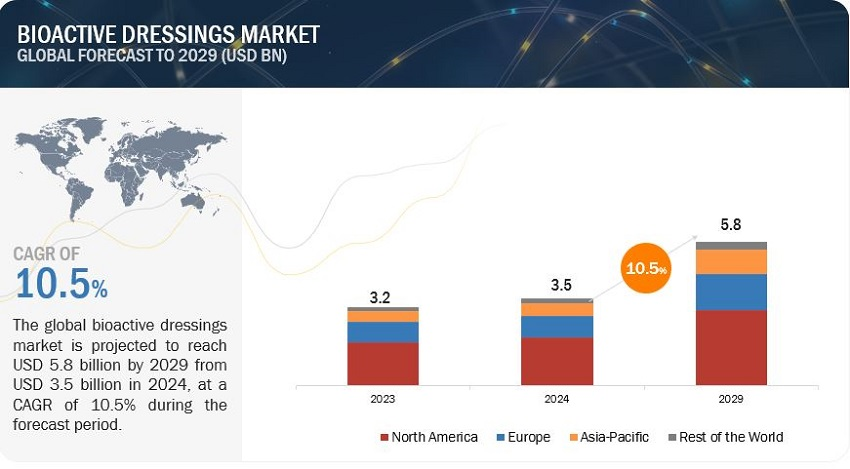 The global Bioactive Dressings Market growth forecasted to transform from USD 3.5 billion in 2024 to USD 5.8 billion by 2029, driven by a CAGR of 10.5%. The need for cutting-edge therapeutic solutions to address the growing incidence of chronic ewounds, such as diabetic ulcers, pressure ulcers, and venous leg ulcers, is driving the market for bioactive wound dressings. Further driving the market's growth are the aging population, the prevalence of diabetes, and increased knowledge of the need for proper wound care management. However, there is a dearth of knowledge and understanding so, the market will be somewhat be restrained by relationships between patients, medical professionals, and healthcare systems.