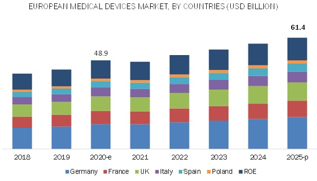 Germany accounted for the largest share of the European medical device market in 2019. The rising geriatric population and the presence of strong healthcare infrastructure in the country are the major factors that are driving the demand for medical devices in Germany.