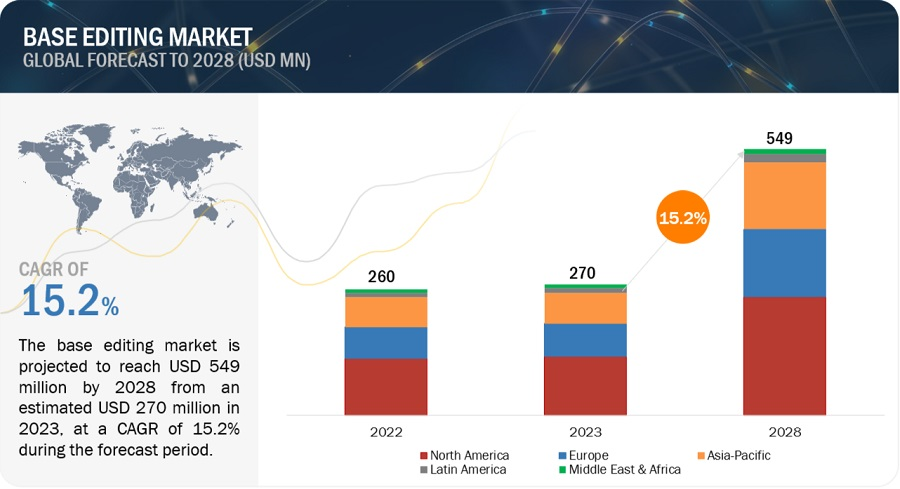 Base Editing Market was worth $270 million in 2023 and is forecast to reach $549 million by 2028, with a CAGR of 15.2%. This comprehensive research study covers industry trends, pricing structures, patent analysis, and insights from conferences and webinars. It also examines key stakeholders and consumer buying behavior. Market growth is fueled by the increasing prevalence of genetic diseases and heightened awareness of genetic mutations’ impact on health, leading to a surge in demand for precise gene editing technologies.